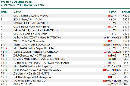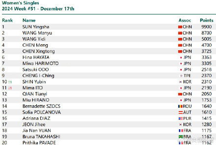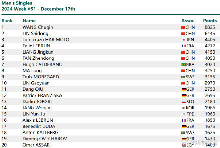 2024年菠菜赚钱平台游戏中心入侵外围博彩网站(www.zawce.com)2024国际乒联第51周排名公布,男单方面,王楚钦以8825分继续排名第一。林诗栋排名第二,梁靖崑排名第五,樊振东排名第六,马龙排名第八,林高远排名第十。女单方面,孙颖莎以9900分继续霸榜第一,王曼昱、王艺迪、陈梦、陈幸同分别位列第二至第五。男双方面,袁励岑/向鹏排名第三,林高远/林诗栋第四,马龙/王楚钦第五。女双方面,陈梦/王曼昱排在第一,钱天一/陈幸同第四。混双组合,王楚钦/孙颖莎第一、林诗栋/蒯曼第三。